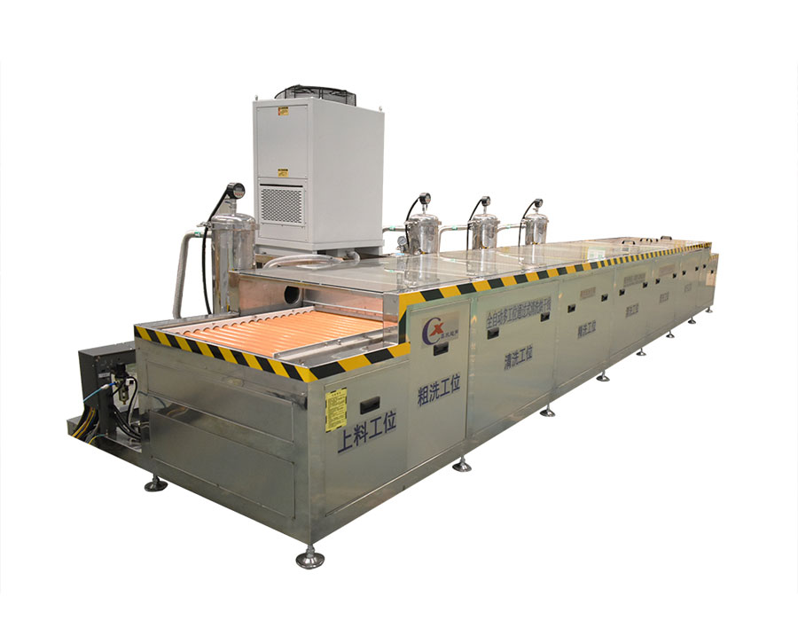 本設(shè)備為通過式玻璃清洗烘干線,清洗部分傳動形式采用專用輸送鏈條帶動,與玻璃接觸面都是橡膠包裹之后的滾筒,清洗該設(shè)備有上料滾筒線、噴淋清洗工位、毛刷清洗工位、噴淋清洗工位、超聲波清洗工位、噴淋漂洗工位、風(fēng)干工位、下料滾筒線、溫控水加熱系統(tǒng)、溫控空氣加熱系統(tǒng)、PLC+觸摸屏控制系統(tǒng)、管路系統(tǒng)及智能電器控制系統(tǒng)等組成。該設(shè)備清洗效果好、提高了工件的清潔度。該機結(jié)構(gòu)設(shè)計及工藝安排合理、自動化程度高、清洗精度高,有效解決了此類工件的清洗難題
